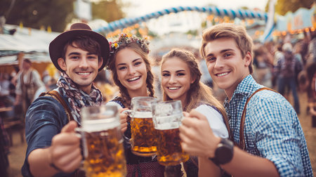 A group of young people Friends toasting with glasses of beer at the Oktoberfest germany Soft focus. Shallow DOF