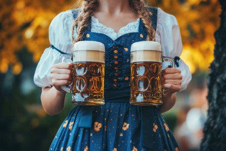 Close-up photo of blonde in dirndl, traditional festival dress, holding two mugs of beer in her hands outdoors. Oktoberfest, St. Patrick’s day, international beer day concept.