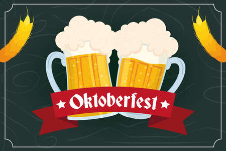 oktoberfest party lettering in ribbon with beers jars vector illustration design