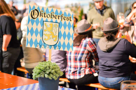 Toronto, Canada - September 29, 2017: Visitors in a festival tent of the Oktoberfest beer festival in Toronto, Ontario, Canada on September 29, 2017. The world's largest beer festival Oktoberfest take place until October 3, 2017.