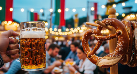 Hand holding a frothy beer stein and a pretzel at a lively oktoberfest beer garden, with blurred festive lights and people celebrating in the background.