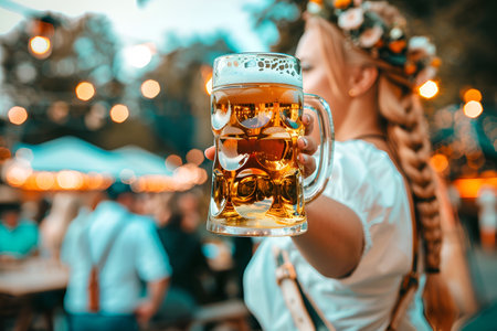 A woman in traditional attire holds a frosty beer mug at Oktoberfest, with festive lights and blurred background creating a joyful atmosphere.
