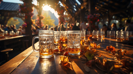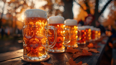 A beautiful glass of beer sits on a wooden table, surrounded by vibrant autumn scenery and a lively festival atmosphere, capturing moments of joy and friendship.