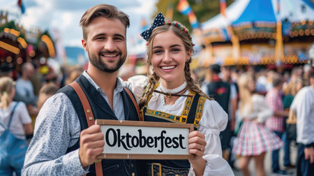 Two people in traditional Bavarian clothing holding an Oktoberfest sign at a crowded festival. Oktoberfest celebration, Bavarian culture, festive attire, beer festival, cultural event