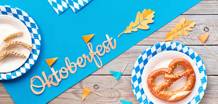 Oktoberfest, flat lay on rustic wooden table with blue paper spread, pretzels on disposable plates, wheat ears, decorative flags and Autumn leaves. Top view, panoramic banner composition.