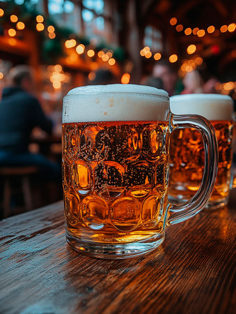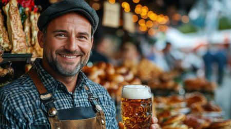 A person holds a large, frothy mug of beer, showcasing it proudly amidst a lively market filled with baked goods and twinkling lights. The atmosphere is warm and inviting, capturing the spirit of celebration.
