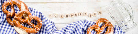 Oktoberfest food menu, bavarian pretzels with beer bottle mug, white wooden background copy space top view banner format