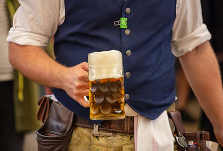 Oktoberfest, Munich, Germany. Waiter with traditional costume holding one beer, closeup view