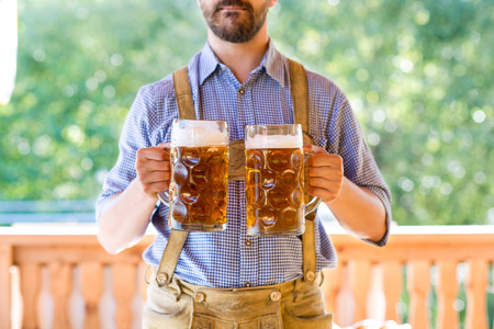 Unrecognizable young men in traditional bavarian clothes holding two mugs of beer. Oktoberfest. Sunny summer garden.