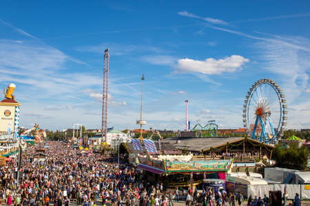 Munich, Germany - September 28: visitors, beertents and fairground rides on the oktoberfest in munich at September 28, 2019