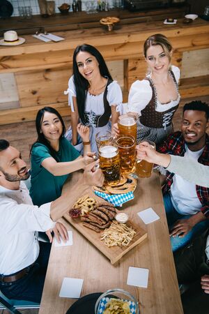 beautiful waitresses in traditional german costumes clinking mugs of beer with multicultural friends