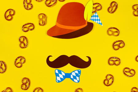 Germany face silhouette with bavarian brown hat and tie bow, mustache. Sweet tasty snaks pretzels as appetizer to beer. Ads event of october beer festival in autumn october month