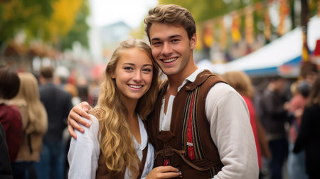 Young German couple wearing traditional clothes at October Fest parade in Germany