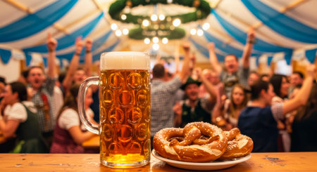 Beer stein and pretzels in a festive German beer hall. Lively celebration of Oktoberfest.