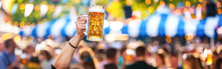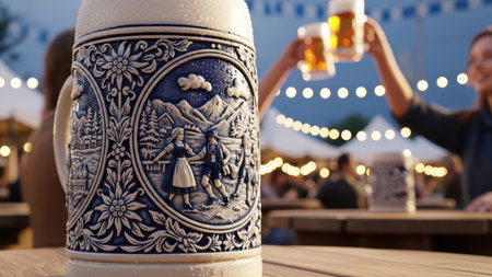 Traditional beer stein at festive outdoor oktoberfest celebration with cheerful toasts.