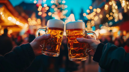 A pair of hands clinking beer mugs together in a celebratory gesture, with a blurred background of a lively party or festival scene.