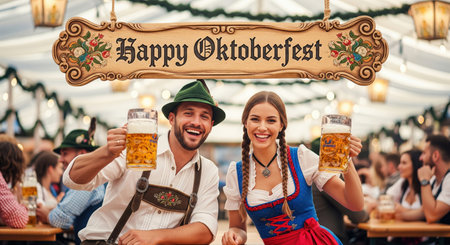 A happy couple in traditional Bavarian attire, a man in lederhosen and a woman in a dirndl, are raising large beer mugs in a toast. They are smiling at the camera under a wooden sign that reads Happy Oktoberfest. The background shows a festive beer tent with blurred people and decorations.