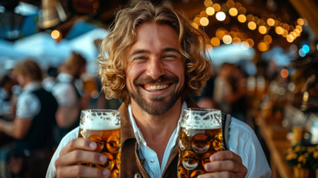 Oktoberfest. Beautiful blonde man in traditional Bavarian costume holding two beer glass, laughing and on festival background.