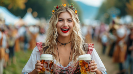 Oktoberfest . beautiful blonde woman in traditional Bavarian dress holding two beer mugs, red lipstick and mouth laughing , festival background