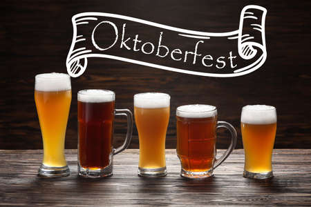 Mugs and glasses of cold beer on table. Oktoberfest celebration