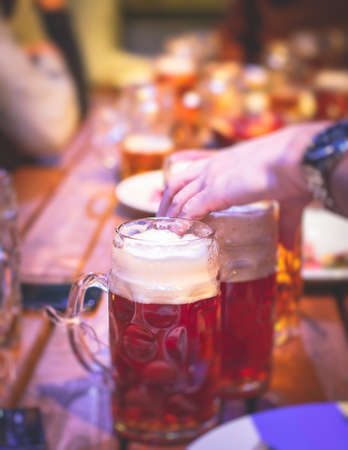 Mug of beer in the hands of a man on the background of the Oktoberfest