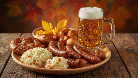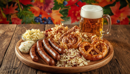 Assorted German sausages, salted pretzels and coleslaw with a and refreshing cold foamy light beer on a rustic table. In the background are bright autumn leaves. Festive food concept for Oktoberfest.