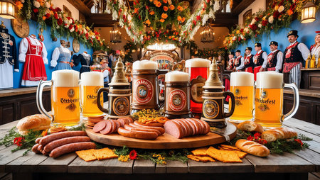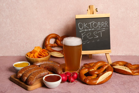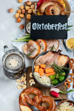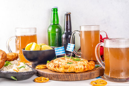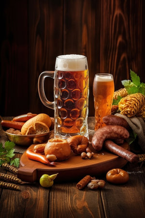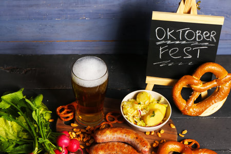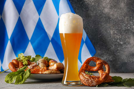 Bavarian German holiday traditions. Oktoberfest food and beer glass mug. Background for congratulations with Oktoberfest, autumn restaurant menu.