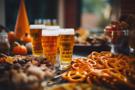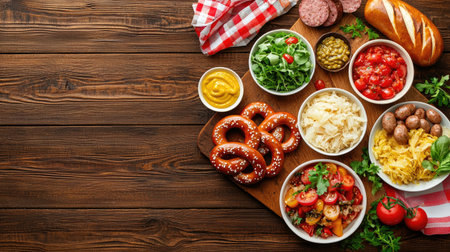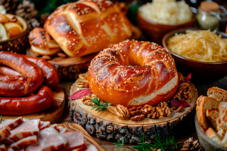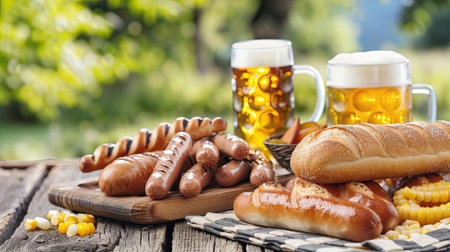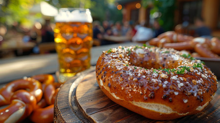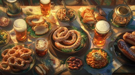 A vibrant tabletop scene featuring an array of delicious foods and drinks. Enjoy the tempting variety of pretzels, sausages, bread, and refreshing beer, perfect for gatherings or festive occasions.