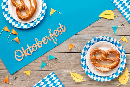 Oktoberfest rustic background. Two prezels in blue and white checkered disposable paper plates. Flat lay on rustic wooden table decorated with Autumn decorations.