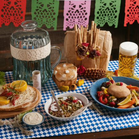A lively spread of Mexican cuisine and beverages awaits, set against a backdrop of traditional papel picado banners. The table is laden with various appetizing dishes, skewers of food, and a refreshing beer, promising a festive and flavorful gathering perfect for any celebration or cultural event. The detailed presentation highlights the richness of Mexican culinary traditions.