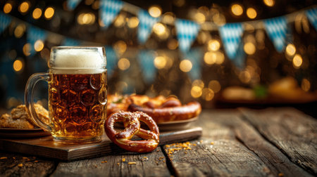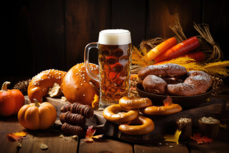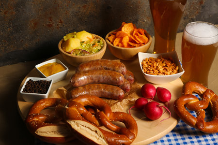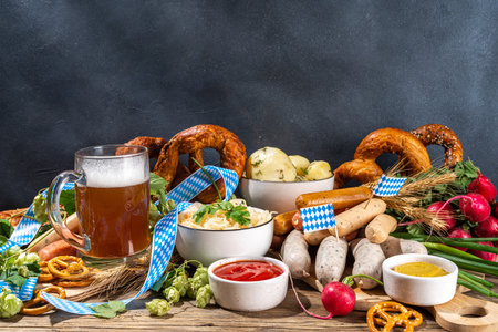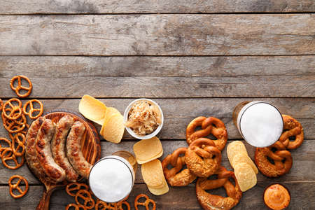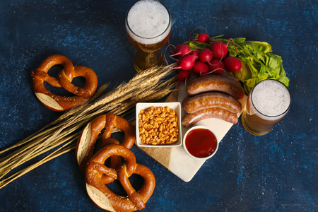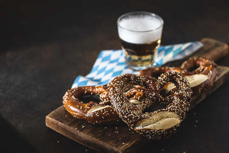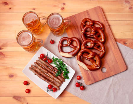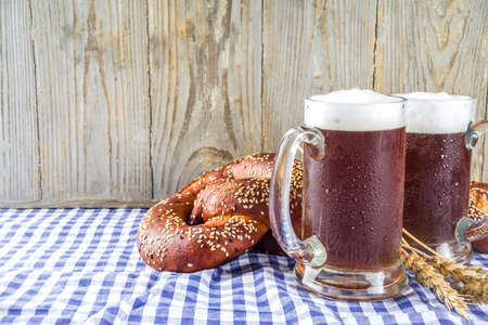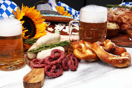 Bavarian delicacies and Oktoberfest beer with pretzels on wooden backdrop