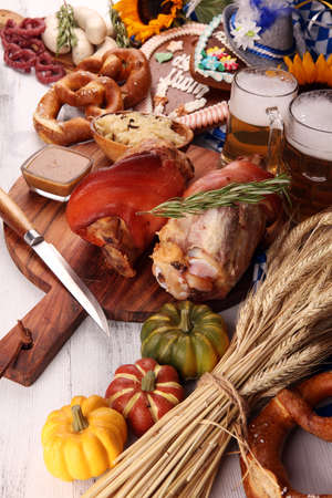 Traditional German cuisine, Schweinshaxe roasted ham hock. Beer, pretzels and various Bavarian specialties. Oktoberfest background