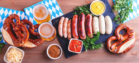 Oktoberfest table with traditional food. Roasted sausages, pretzels, beer, sour cabbage, mustard on wooden background, top view, copy space, web banner