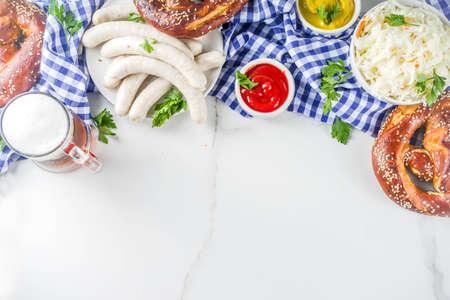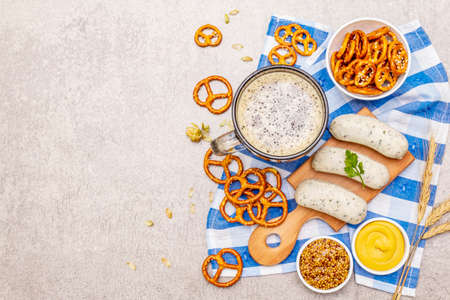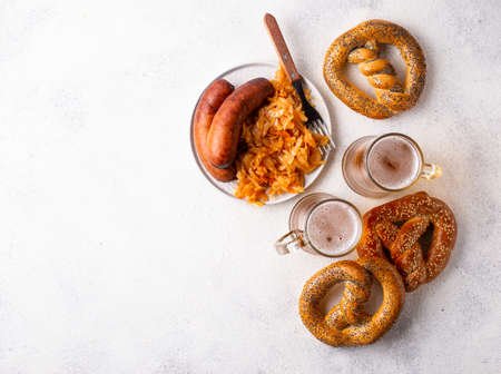 Traditional german food, Bavarian sausages, pretzels, potato, sauerkraut, beer mug on a light background. Top view.