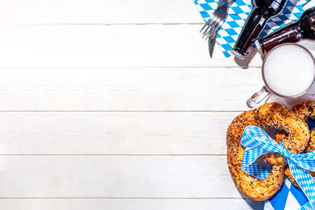 Oktoberfest holiday background, menu mockup. Bavaria flag oktoberfest festival napkin, pretzel, beer bottle and mug on white wooden background, copy space top view