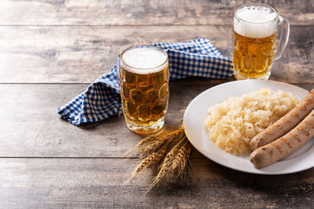 Traditional german food of pretzels, sauerkraut, bratwurst and beer on wooden table