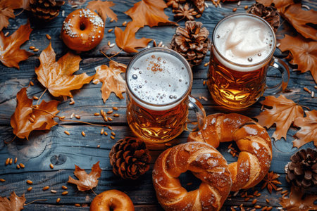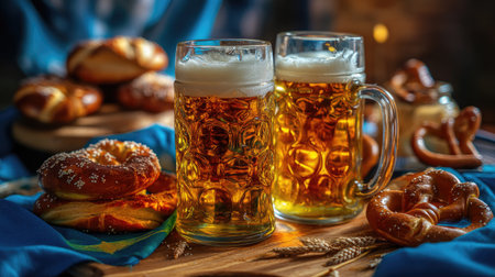 Two frosty glasses of beer beside fresh pretzels on a wooden table, adorned with blue fabric, creates a warm and inviting atmosphere for any gathering.