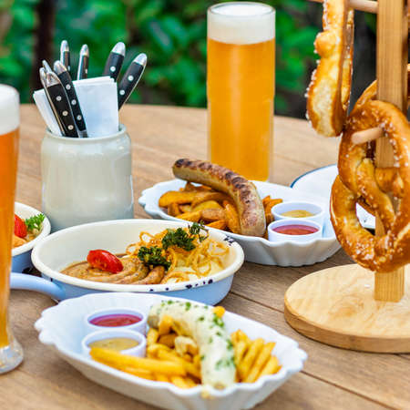 Beer with sausage, meat meal, pretzel, sauce on the table