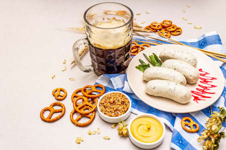Oktoberfest set. Dark beer, weisswurst, pretzels, mustard, spikelets of grain, hop. Traditional German cuisine, festival food. Mug, linen napkin, stone concrete background, wooden backdrop copy space