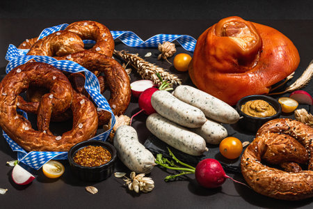 festival decoration symbols made from Pretzel loaf, beer, sausage, potato chips and Bavarian white and blue fabric on dark stone background.