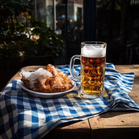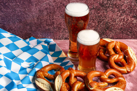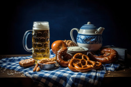 Cold full beer mug with Beirian pretzels on the wooden table covered with traditional blue and white tablecloth during Oktoberfest. Still life.
