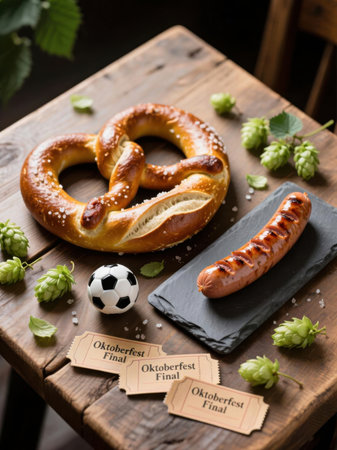 Oktoberfest pretzel and sausage on a wooden table with soccer ball and tickets.