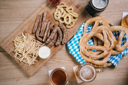 top view of mugs with light and dark beer, fried sausages, onion rings, french fries and pretzels on wooden table in pub