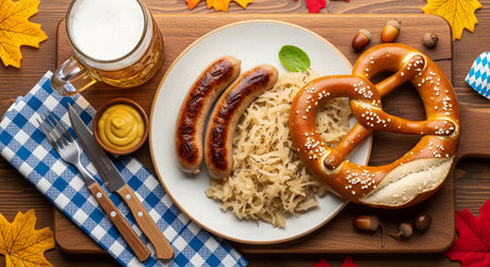 A traditional Oktoberfest meal with Close-up of Bavarian sausages, salted pretzels, cheese, sauerkraut and a refreshing cold foamy light beer on a rustic table. Autumn leaves in the background.