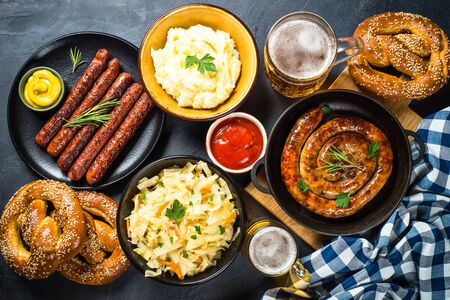 Selection of traditional German food Oktoberfest. Beer, baked pork shank, popcorn, assortment of different sausages, homemade bretzels. On a black stone background copy space top view