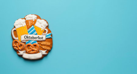 Oktoberfest gingerbread cookies decorated with pretzels and beer mugs on a solid blue background with copy space.