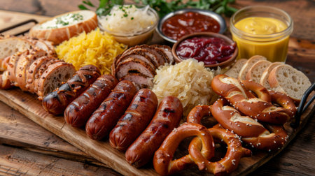A platter of German sausages with sauerkraut, mustard, and soft pretzels, served on a wooden board.