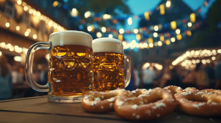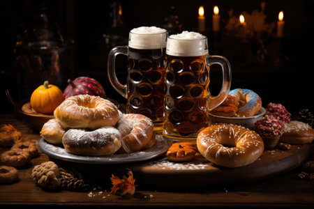 Beer mugs with fresh pretzels or brezen at Oktoberfest, Munich, Germany, Generative AI