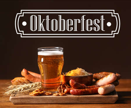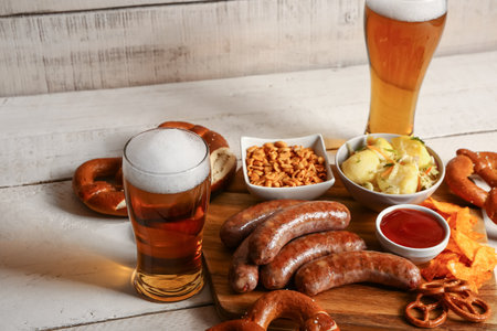 Glass of cold beer, wooden board with Bavarian sausages and snacks on table. Oktoberfest celebration