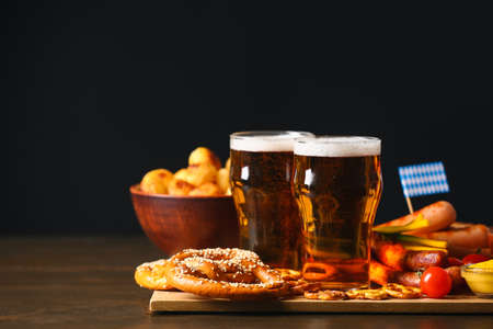 Board with glasses of beer, food and flags on table against dark background. Oktoberfest celebration